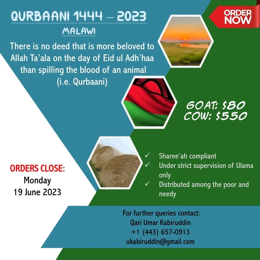 We kindly request your generous assistance and donation, whether it be your obligatory or optional Qurbāni this year in Malawi.